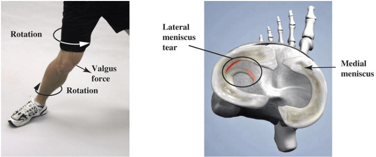 En personas jóvenes generalmente se da por una fuerza inesperada cuando la rodilla esta algo doblada y además giras sobre su propio eje. Este mecanismo es habitual en cambios de dirección, desaceleraciones, caídas posterior a un salto.